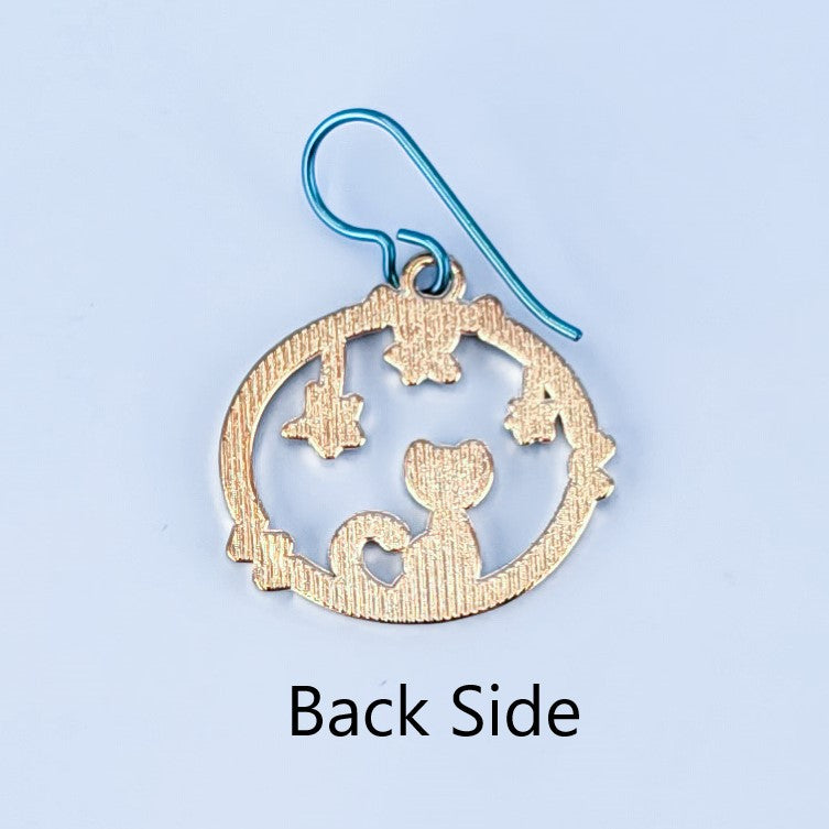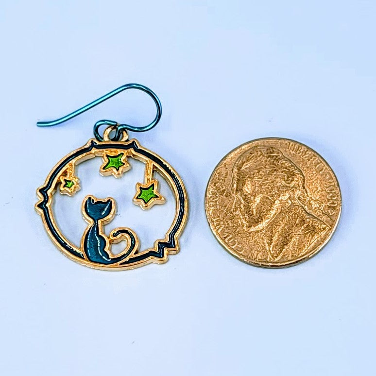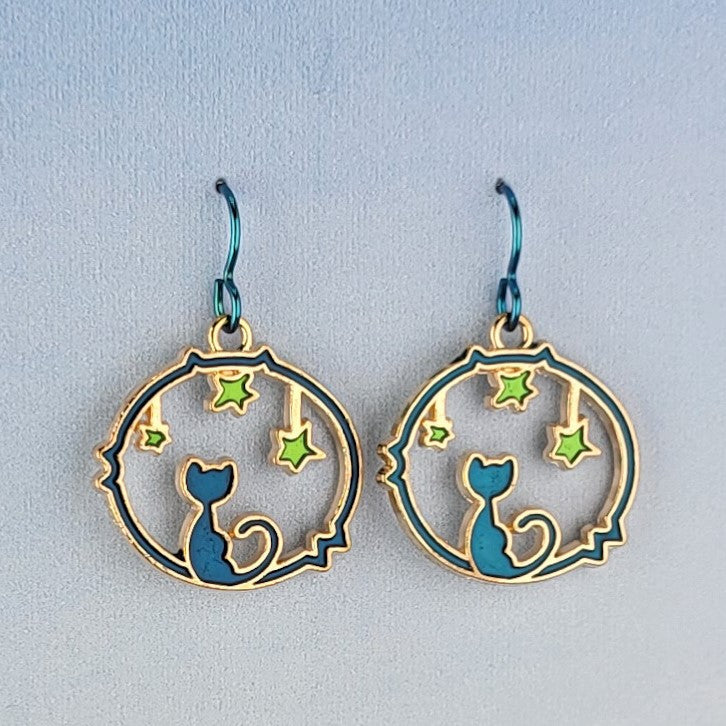 Handmade Cat and Star Earrings, Blue and Green Enamel